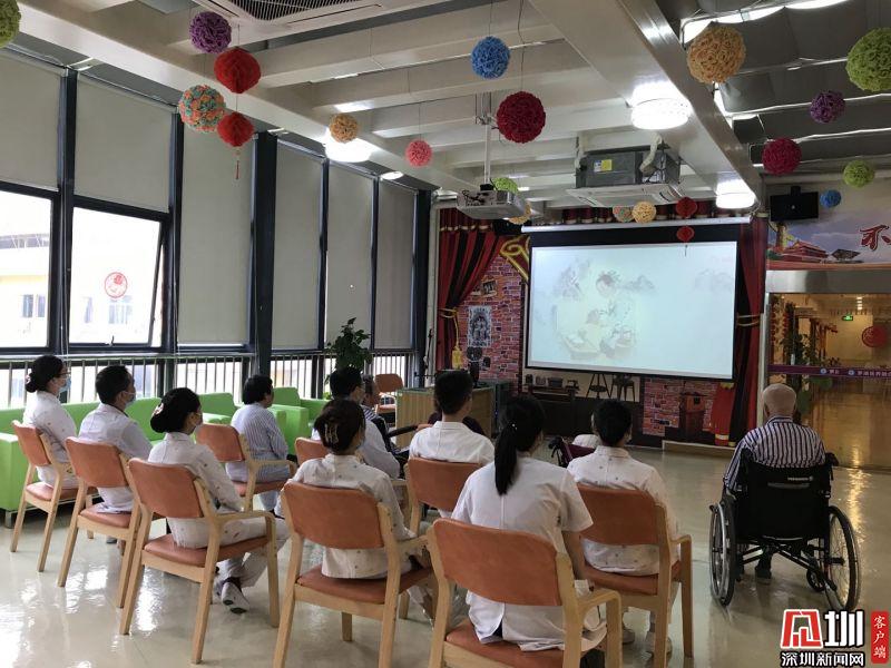羅湖區(qū)醫(yī)養(yǎng)融合老年病醫(yī)院值班醫(yī)護(hù)人員與老人共同觀看《銘記,是為了更好前行》。