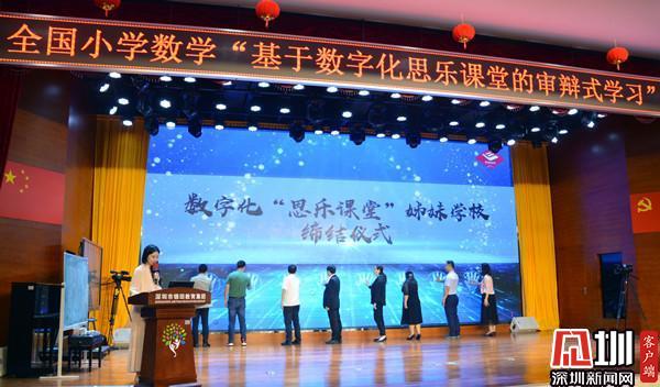 開幕式上,深圳市錦田小學與西安東城一小、江西贛州市黃金實驗小學;深圳市布心小學、江西省贛州市厚德路小學締結數(shù)字化“思樂課堂”姊妹學校。深圳市羅湖區(qū)教科院院長郭玉竹與羅湖區(qū)中學地理教研員數(shù)字化思樂課堂項目負責人劉春明為締結學校授牌。緊接著,東昌、錦田、水田、蓮南、布心、螺嶺6所數(shù)字化“思樂課堂”實驗小學數(shù)學科組代表進行經驗分享。