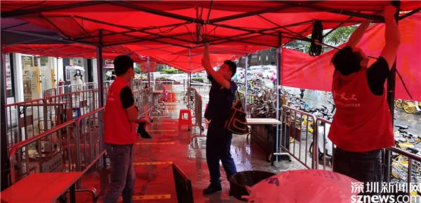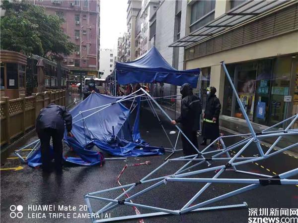 6月22日早上,黃貝街道工作人員在風雨中搭建核酸檢測點帳篷。