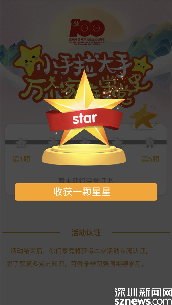 本次活動面向羅湖轄區(qū)中小學學生及家庭。6月28日至7月8日,學生及家長可以下載“羅湖Plus”APP,點擊首頁“服務(wù)”進入“小手拉大手黨史學習”活動專欄并完成注冊?;顒悠陂g,每完成1次打卡即答對全部題目,可獲得1次親子“點亮星星”的機會。每輪答題如有1道答錯即為“闖關(guān)失敗”,可以點擊“再來一次”繼續(xù)答題,直到全部答對為止。10天內(nèi)完成5次打卡任務(wù),即可點亮5顆小星星獲得“升旗手”個人榮譽證書。