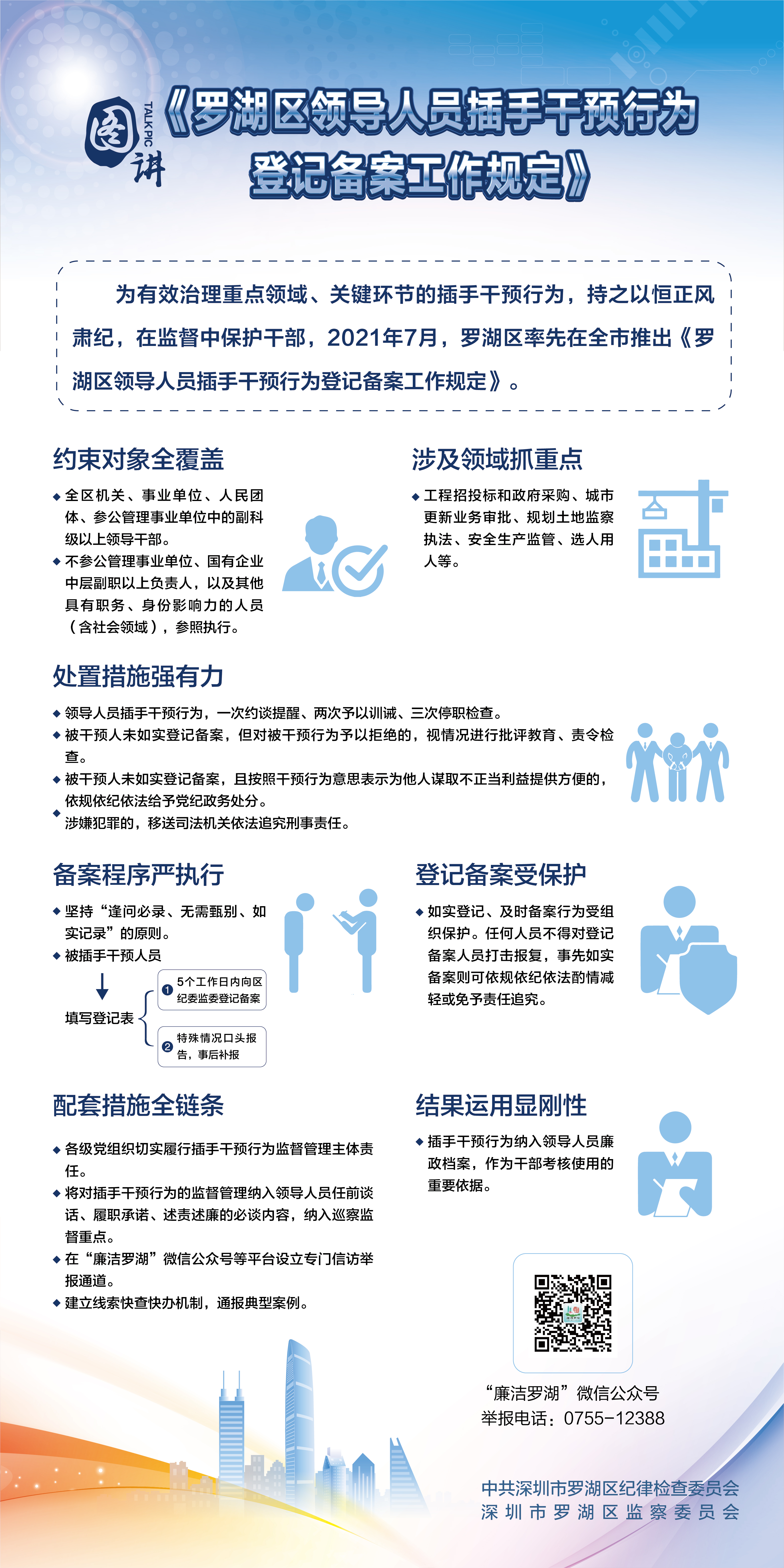 為充分釋放制度活力,羅湖區(qū)紀(jì)委監(jiān)委完善了全鏈條配套措施。插手干預(yù)行為的監(jiān)督管理納入領(lǐng)導(dǎo)人員任前談話、履職承諾、述責(zé)述廉的必談內(nèi)容和巡察監(jiān)督重點(diǎn),插手干預(yù)行為納入領(lǐng)導(dǎo)人員廉政檔案,作為干部考核使用的重要依據(jù)。同時(shí)在“廉潔羅湖”微信公眾號(hào)等平臺(tái)設(shè)立信訪專欄,建立線索快查快辦機(jī)制,通報(bào)典型案例,讓插手干預(yù)行為暴露在陽光下。