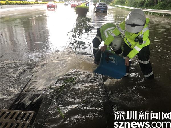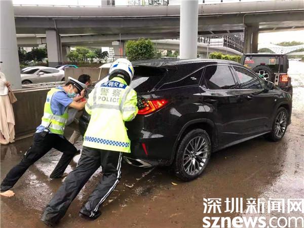 暴雨突襲,蓮塘片區(qū)羅沙路、沿河路羅芳立交積水嚴(yán)重,因排水能力較弱,許多車輛困在積水中無法通行,羅湖交警大隊(duì)機(jī)訓(xùn)中隊(duì)民警李勝軍和李作祥分別組織隊(duì)員開展救援行動(dòng)。
