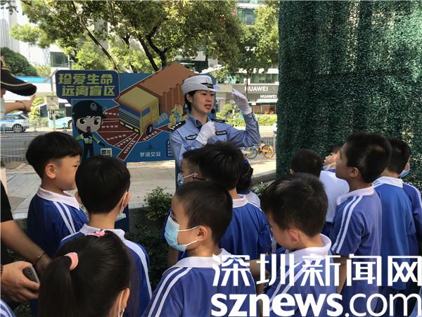結束警營的參觀,羅湖交警組織學生們前往東門社區(qū)交通安全主題公園開展交通安全教育。在民警的引導下,同學們被趣味游戲所吸引,在模擬機動車道玩起了“交通安全齊步走”,在交通標識轉轉墻前認識各類交通標識,在大車盲區(qū)警示等設施裝置中進行沉浸式體驗。