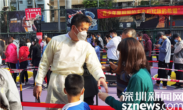 羅湖區(qū)審計(jì)局黨組書(shū)記黃吉南在新村社區(qū)防疫現(xiàn)場(chǎng)指導(dǎo)核酸檢測(cè)流程。