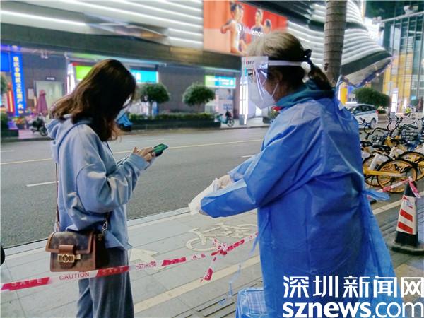 記者了解到,周先珍上個(gè)月才搬到老圍社區(qū)名仕閣小區(qū),成為老圍人還不到一個(gè)月,被社工在入戶探訪時(shí)發(fā)現(xiàn),把她拉入居民群。她在居民群里看到社區(qū)緊急招募志愿者,立刻報(bào)了名,不到8點(diǎn)就到了人民銀行門(mén)口臨時(shí)檢測(cè)點(diǎn),做到9點(diǎn)半,人民銀行檢測(cè)點(diǎn)撤了以后,聽(tīng)說(shuō)禧程酒店臨時(shí)檢測(cè)點(diǎn)需要人,她趕到禧程酒店,一來(lái)就把守入口,引導(dǎo)市民出示健康碼。原本做到10點(diǎn)就可以下崗了,但她看到不斷有市民前來(lái)檢測(cè),就主動(dòng)留下來(lái)。