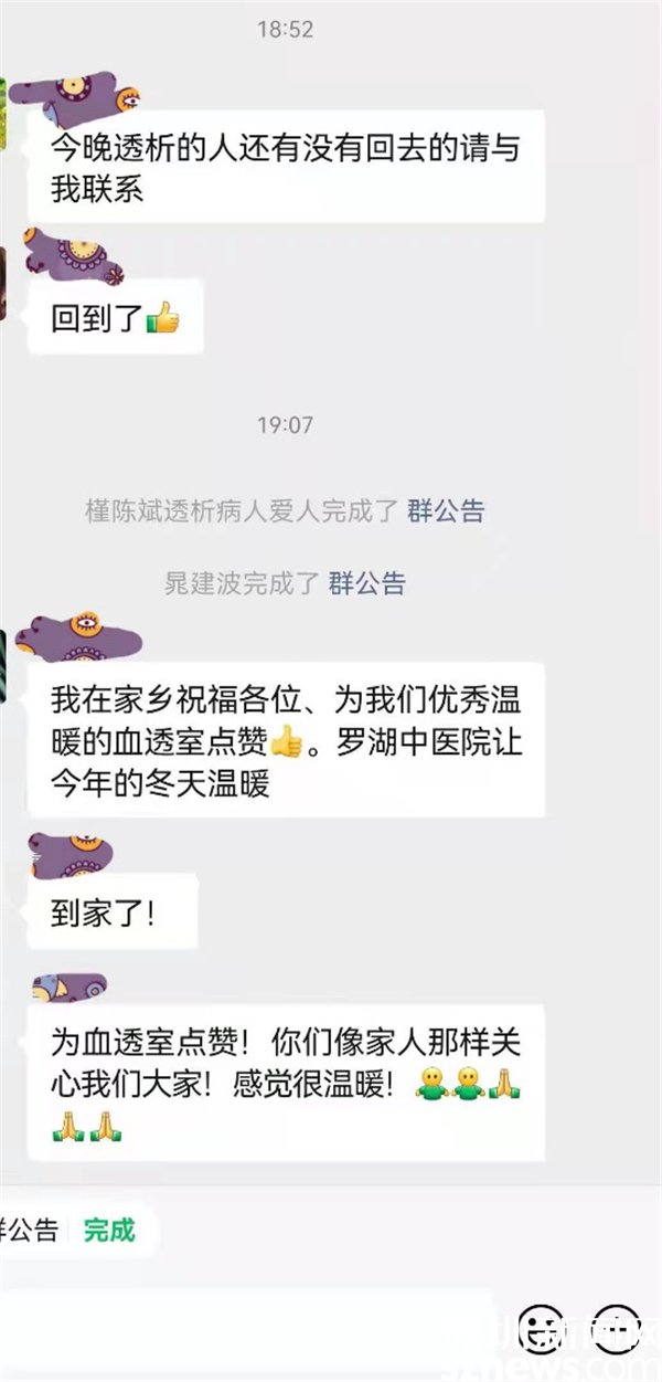 據(jù)羅湖區(qū)中醫(yī)院腎病科血液透析室主任王靜介紹,“0107”疫情發(fā)生后,蓮塘片區(qū)管控區(qū)域的居民只進不出。固定來院血透的患者共有70多名,其中有20多名患者居住在蓮塘片區(qū),還有50多人居住在片區(qū)以外。1月7日下午,第二班的血透患者就面臨著如何回家的問題,院領(lǐng)導(dǎo)迅速部署,與區(qū)疫情防控指揮部充分溝通,醫(yī)務(wù)科、后勤支援部和血透室協(xié)助安排好患者離院事宜。“醫(yī)院安排車輛把這些患者送到封鎖路口,讓患者放心透析,一定讓病人能夠順利回家?!贬t(yī)院常務(wù)副院長趙宏堅定地說。