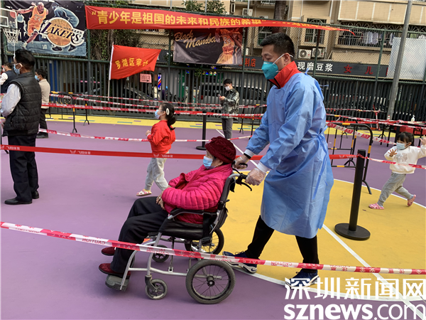 現(xiàn)場(chǎng)工作人員協(xié)助年長(zhǎng)者做核酸檢測(cè)。