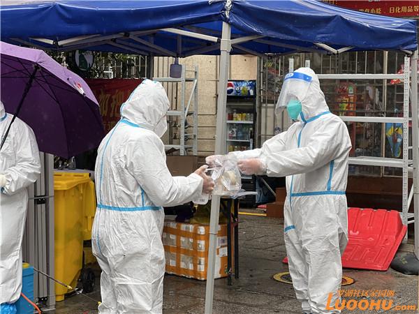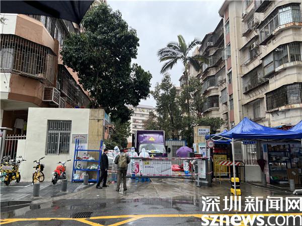 2月22日早上,記者來到處于管控區(qū)域的桂園街道鹿苑小區(qū)。只見身穿防護(hù)服的“大白”們來來往往地在門口忙碌著,偶爾有外賣小哥將外賣放在小區(qū)入口的貨架上便離開,雨水打濕了門前拉起的紅色警戒線。鹿丹村社區(qū)黨委書記陳姍姍披著簡單的一次性雨衣,不斷響起的電話,居民的一聲聲詢問,都是她需要盡快處理的各項(xiàng)管控工作。