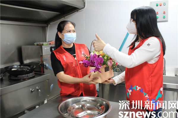 在社區(qū)廚房,老圍社區(qū)居民周文清正在忙碌,疫情開始以來,社區(qū)擔(dān)負(fù)著下沉人員和醫(yī)務(wù)人員的中餐和晚餐,每餐四五十人吃飯,任務(wù)繁重,廚師一人根本忙不過來。家住老圍花園的社區(qū)居民賴秀文、周文清得知情況后,立刻趕來幫廚,洗菜、切肉、炒菜、分裝飯盒、搞衛(wèi)生,樣樣都搶著干。羅湖區(qū)最美家庭賴秀文,一連兩個(gè)星期在社區(qū)幫廚,發(fā)揮她高超的廚藝,將每一道菜都做得色香味俱全。有了這些熱心居民的協(xié)助,一線人員得以及時(shí)吃上熱乎乎的飯菜,保障了防疫工作有序進(jìn)行。她們用自己的方式參與疫情防控,為社區(qū)安寧貢獻(xiàn)一己之力。