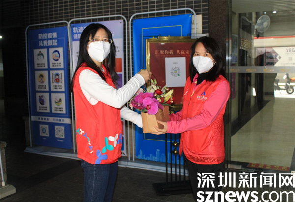 在老圍花園C2卡口,老圍社區(qū)黨委書記、婦聯(lián)主席許少瓊將花籃送到堅(jiān)守在這里的居民義工陳艷芳手中,感謝她對(duì)社區(qū)疫情防控的支持。一直以來,陳艷芳只要有空就到社區(qū)做義工,核酸檢測(cè)點(diǎn)、小區(qū)卡口都是她的戰(zhàn)場(chǎng),查驗(yàn)綠碼、場(chǎng)所碼、督促戴口罩,測(cè)體溫,早已游刃有余,是名副其實(shí)的抗疫女戰(zhàn)士。她接過花籃,對(duì)許少瓊說,“其實(shí)社區(qū)工作人員更辛苦?!?/p>