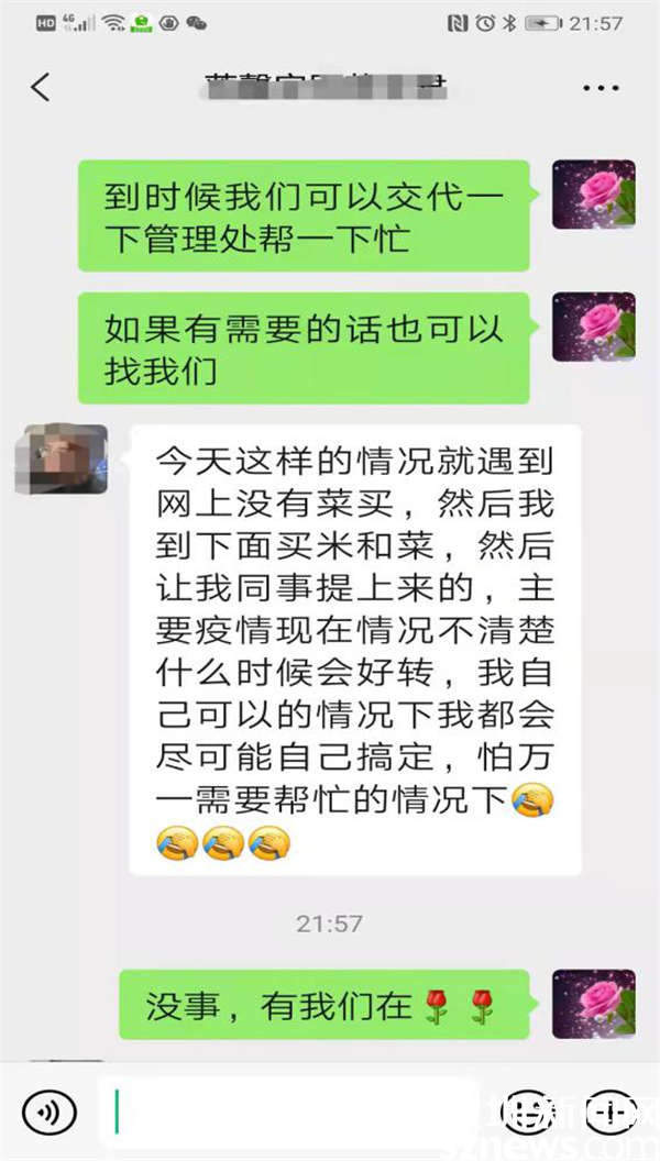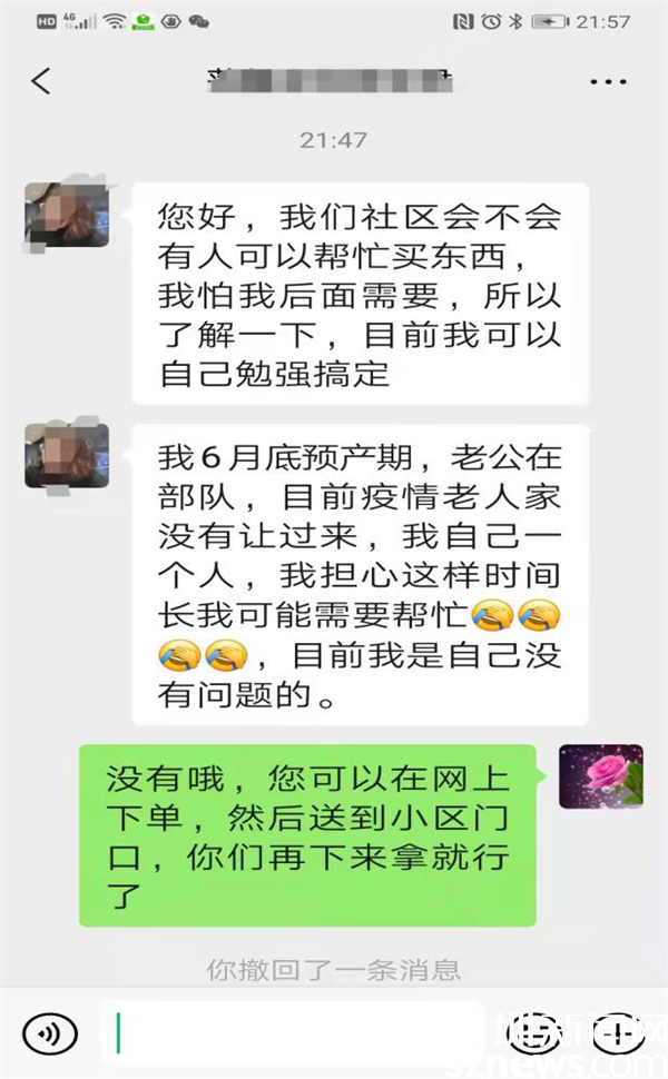 3月13日晚近十點,家住蓮塘街道蓮馨家園的黃女士通過微信向畔山社區(qū)黨委副書記鄒紅梅求助,詢問社區(qū)能否在自己待產(chǎn)不方便的情況下幫助購物送貨……。原來,黃女士預產(chǎn)期在6月份,丈夫在部隊服役,因為疫情原因,家中老人無法過來深圳照顧,只能自己在家休養(yǎng),心理壓力較大顧慮較多。了解到情況后,鄒紅梅耐心疏導黃女士焦慮和恐慌情緒,說明社區(qū)的關愛措施,并微信回復說,“需要幫忙,可以找我們。放心吧,有我們在?!?/p>