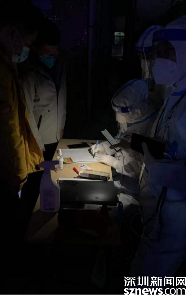 ▲臨時工作場所尚未配備照明設備,下沉干部打著手機閃光燈登記居民采樣信息