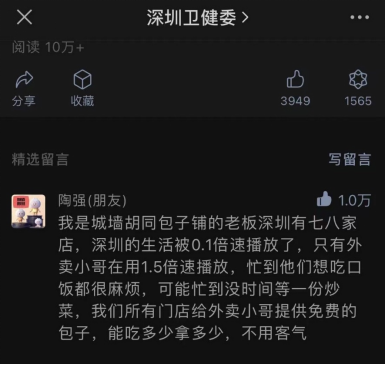 記者注意到,陶先生讓外賣小哥免費吃包子,最早引發(fā)關(guān)注,是源自疫情特殊時期他在深圳衛(wèi)健委下的一條留言:“外賣小哥在用1.5倍速播放,忙到他們想吃口飯都很麻煩,可能忙到?jīng)]時間等一份炒菜,我們所有門店給外賣小哥提供免費的包子,能吃多少拿多少,不用客氣。”