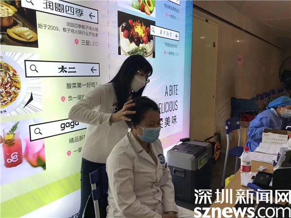 5月1日下午,老圍社區(qū)黨委書記許少瓊來到KKMALL商場負(fù)一樓的疫苗接種點,看望現(xiàn)場的工作人員和醫(yī)務(wù)人員,檢查當(dāng)天的疫苗接種情況,并與工作人員一起動員來往行人進(jìn)行加強針的接種。當(dāng)她聽說負(fù)責(zé)登記的醫(yī)生因為淋雨著涼而頭疼得厲害,卻還在默默堅持時,許少瓊立刻走到醫(yī)生的身后,為醫(yī)生按摩頭部。被按摩的醫(yī)生一再說,“很舒服,輕松了很多。”其實,這一天,連續(xù)工作4個月無休的許少瓊,身體也不是很好,但她用堅強的毅力壓抑了身體的不適,以一貫的積極樂觀影響帶動著身邊的同事。
