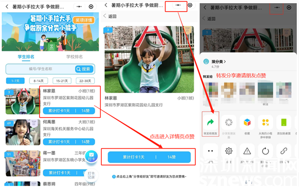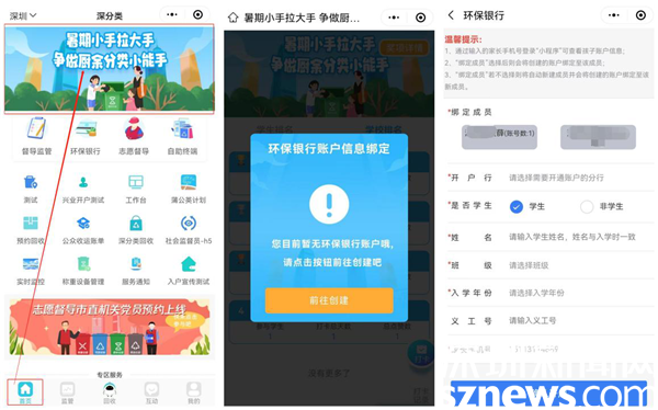學(xué)生及家長可通過“深分類”小程序首頁主題活動入口進(jìn)入活動。在參與活動之前,學(xué)生所在學(xué)校需開通環(huán)保銀行支行,學(xué)生需注冊所在學(xué)校支行的環(huán)保銀行賬戶,并在活動中進(jìn)行賬戶信息綁定、上傳參與學(xué)生照片才可參與后續(xù)打卡集贊活動。