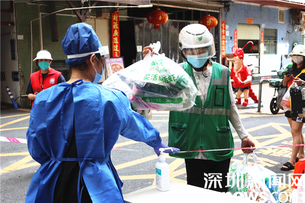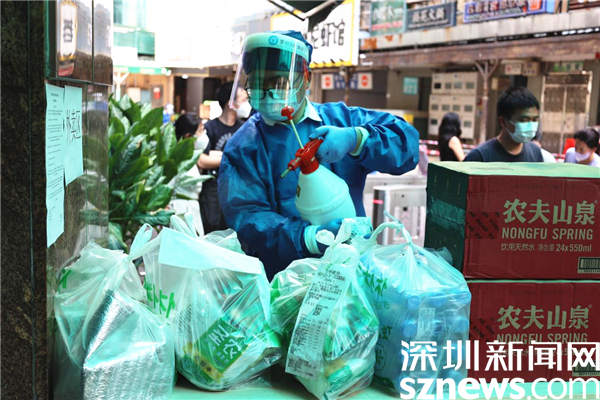 8月29日下午,深圳新聞網(wǎng)記者來到羅湖區(qū)南湖街道文錦社區(qū)凱悅?cè)A庭,只見小區(qū)居民正保持著一米距離有序地進(jìn)行核酸檢測,身穿防護(hù)服的“藍(lán)墩墩”在一旁忙碌著。記者在現(xiàn)場看到偶有“騎士”將居民在網(wǎng)上商城所下單的物資像傳送接力棒一樣交到“藍(lán)墩墩”的手上,“藍(lán)墩墩”接過之后,立即進(jìn)行全方位的消殺工作。