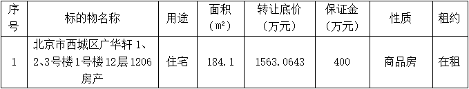深圳報(bào)業(yè)集團(tuán)委托北京產(chǎn)權(quán)交易所對(duì)北京市西城區(qū)廣華軒1、2、3號(hào)樓1號(hào)樓12層1206房產(chǎn)進(jìn)行公開掛牌交易,北京產(chǎn)權(quán)交易所現(xiàn)已公開披露以下轉(zhuǎn)讓信息,廣泛征集受讓方。請(qǐng)有意者登錄北京產(chǎn)權(quán)交易所官方網(wǎng)站報(bào)名辦理意向受讓申請(qǐng)。