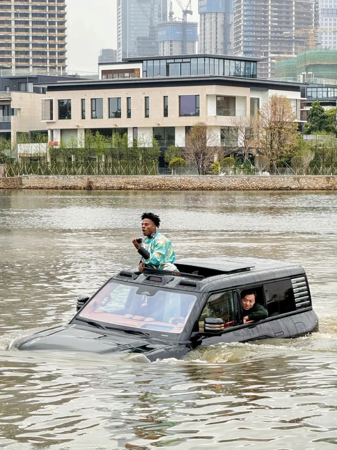 深圳直播第一站,甲亢哥選擇在歡樂海岸體驗比亞迪仰望U8浮水。他先是興致勃勃地與比亞迪仰望U7“斗舞”。