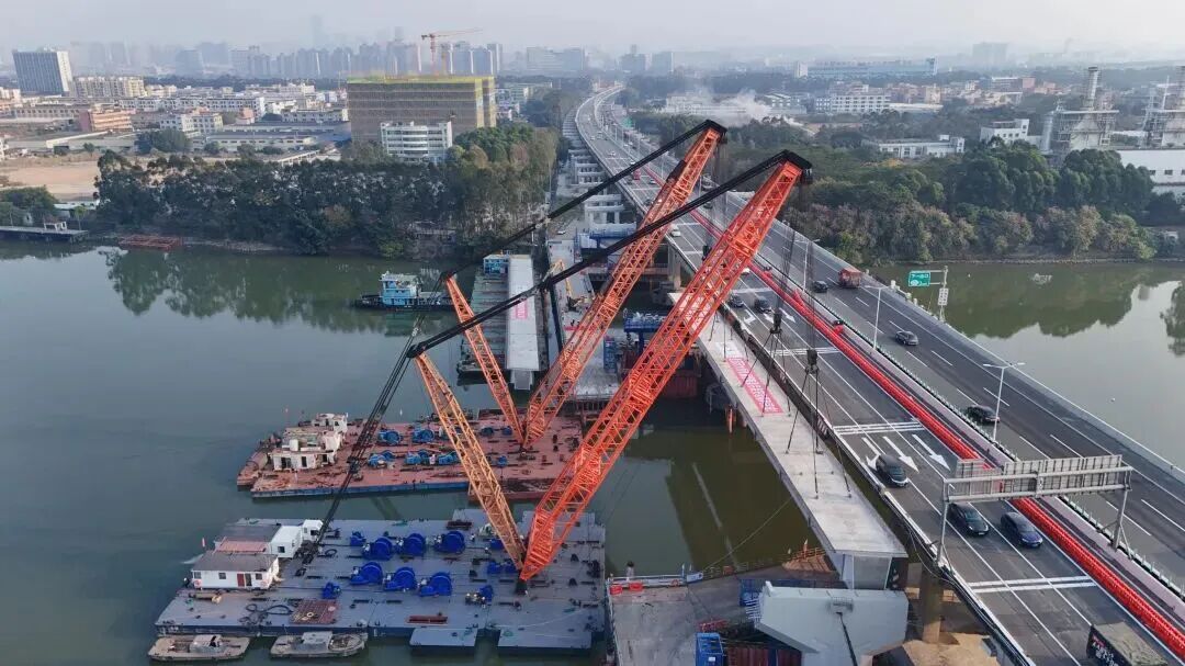 ● 日前,廣深高速改擴建項目(穗莞段)道滘河大橋首片鋼混組合梁安裝完成。