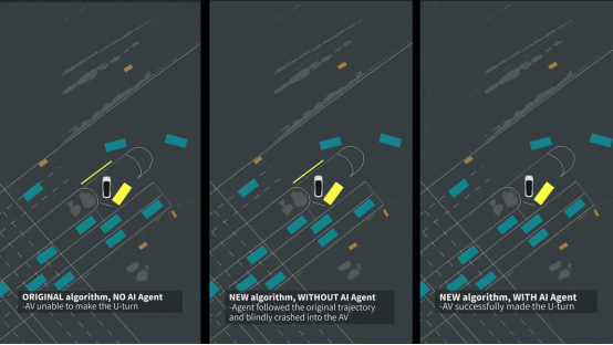 如對比視頻所示,在左側(cè)“原始算法+無AI主體”的組合下,自車表現(xiàn)猶豫,直至對向車輛完全通過后才開始通行,無法滿足效率要求;在中間“新算法+無AI主體”的模擬中,自車僅按預設軌跡行駛,缺乏對周邊車輛行為的預測,最后發(fā)生碰撞,無法滿足安全要求;在最右側(cè)“新算法+AI主體”的加持下,自車能夠?qū)崟r判斷周邊車輛的行駛意圖,在確保安全的前提下流暢通過,實現(xiàn)了效率和安全雙重保障。