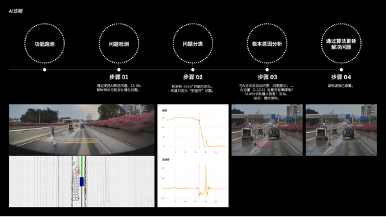 “AI診斷”(AI Diagnosis)模塊進一步實現(xiàn)了問題溯源與修復建議的自動化。它能夠自動捕捉不理想的駕駛行為、分析其根本原因并提供可執(zhí)行的改進方案。比如,當自動駕駛車輛遇到復雜交互場景中識別感知延遲或預測偏差問題,WeRide GENESIS可通過“AI診斷”功能快速修復問題并重新進行場景驗證,確保車輛行為始終符合預期標準。