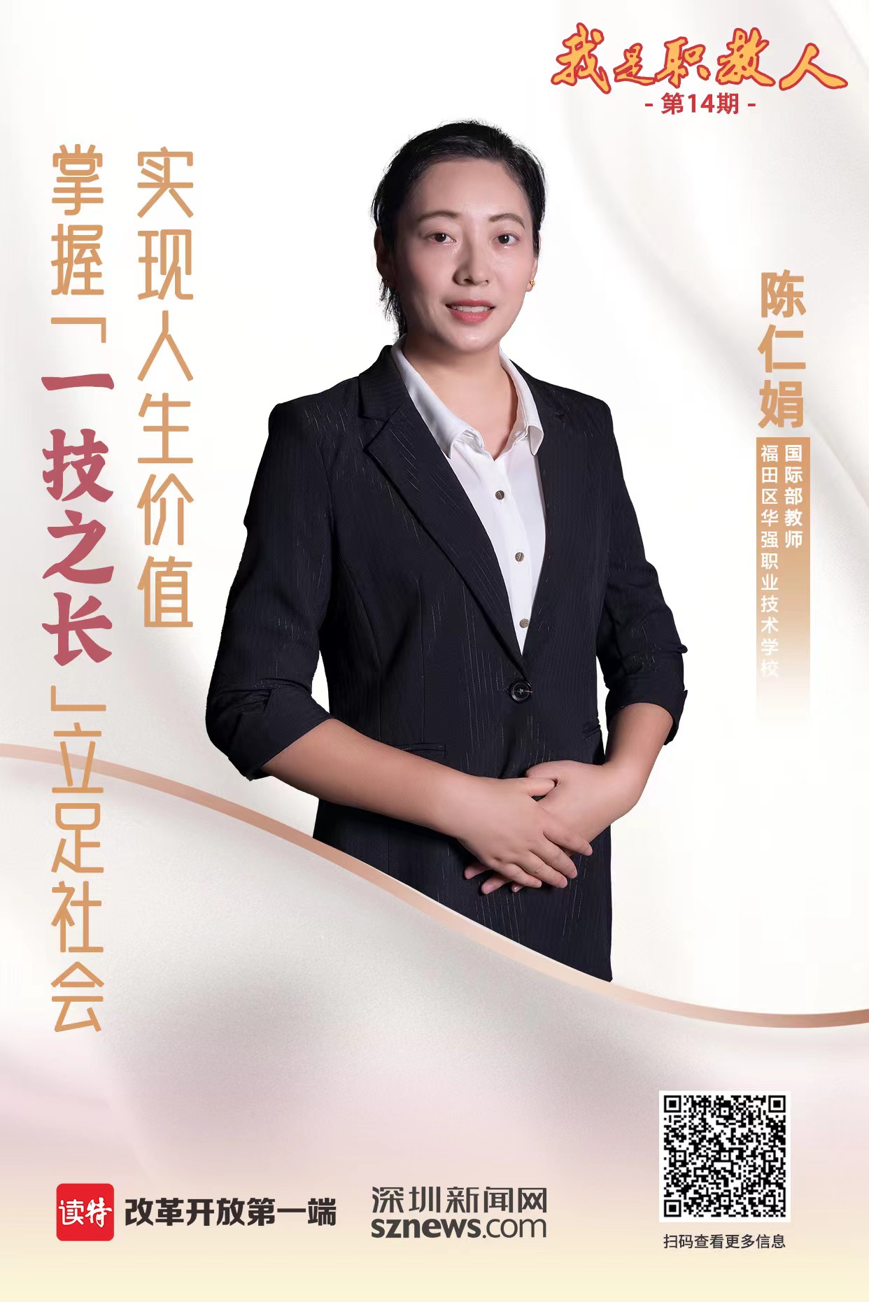抱著對教師行業(yè)的熱愛和教書育人的向往,深圳市福田區(qū)華強職業(yè)技術(shù)學(xué)校國際部教師陳仁娟,畢業(yè)后遵循從教初心,成為職教老師至今已有九年。