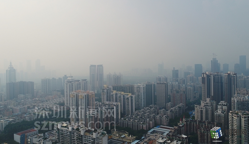無(wú)人機(jī)在數(shù)百米高空俯瞰灰霾籠罩下的深圳中心區(qū),大半個(gè)城區(qū)都看不清楚。
