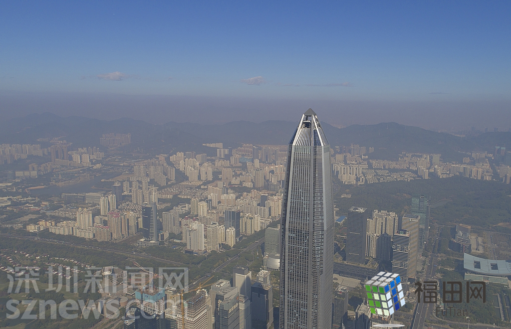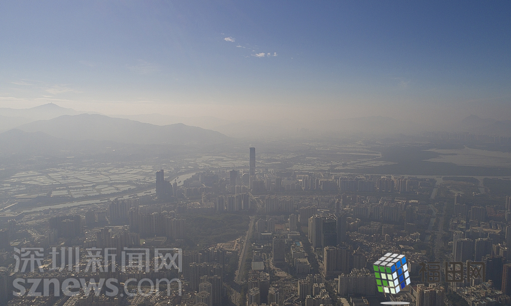 1月18日上午,記者操控?zé)o人機(jī)俯瞰深圳中心區(qū)發(fā)現(xiàn),灰霾將天空“割裂”成一道涇渭分明的界線,把城市籠罩得如同一個(gè)充滿霧靄的森林。從平安金融大廈的上空遠(yuǎn)眺,西南面的深圳灣在灰霾的籠罩下變成了一片“沙漠”,東面的京基一百幾乎被灰霾“吞沒(méi)”,北邊平時(shí)肉眼可看的梅林山也因?yàn)槟芤?jiàn)度較低變得若隱若現(xiàn),南面的米埔濕地也被云遮霧繞。