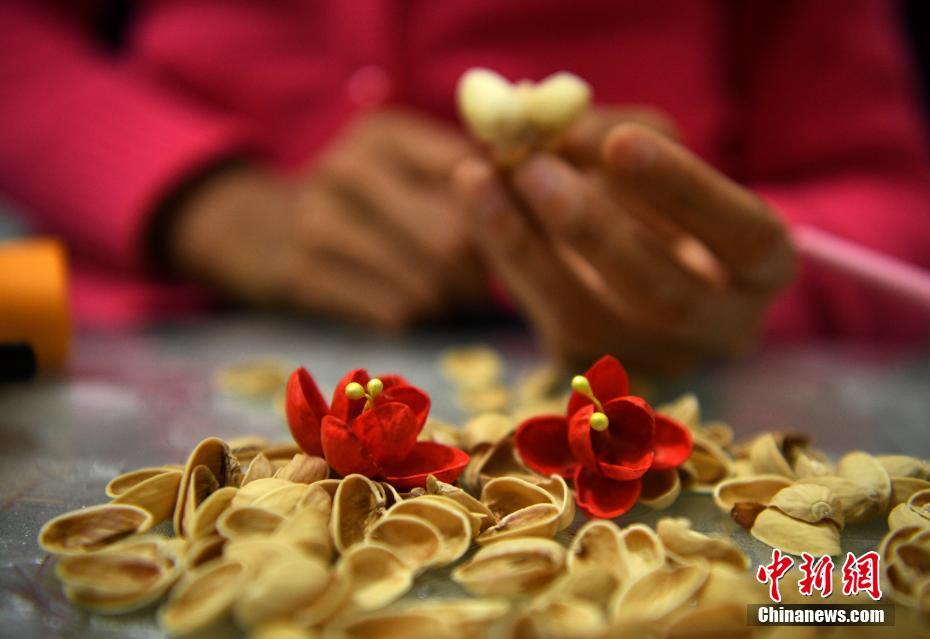 四川樂(lè)山29歲的陳艷因“先天性脆骨癥”被稱為“瓷娃娃”,下肢無(wú)力支撐正常行走,其在愛(ài)心人士的鼓勵(lì)和幫助下,用不懈的毅力、勤奮和靈巧的雙手,在逆境中快樂(lè)堅(jiān)強(qiáng)生活。圖為3月1日,陳艷用開(kāi)心果制作裝飾品“梅花”。