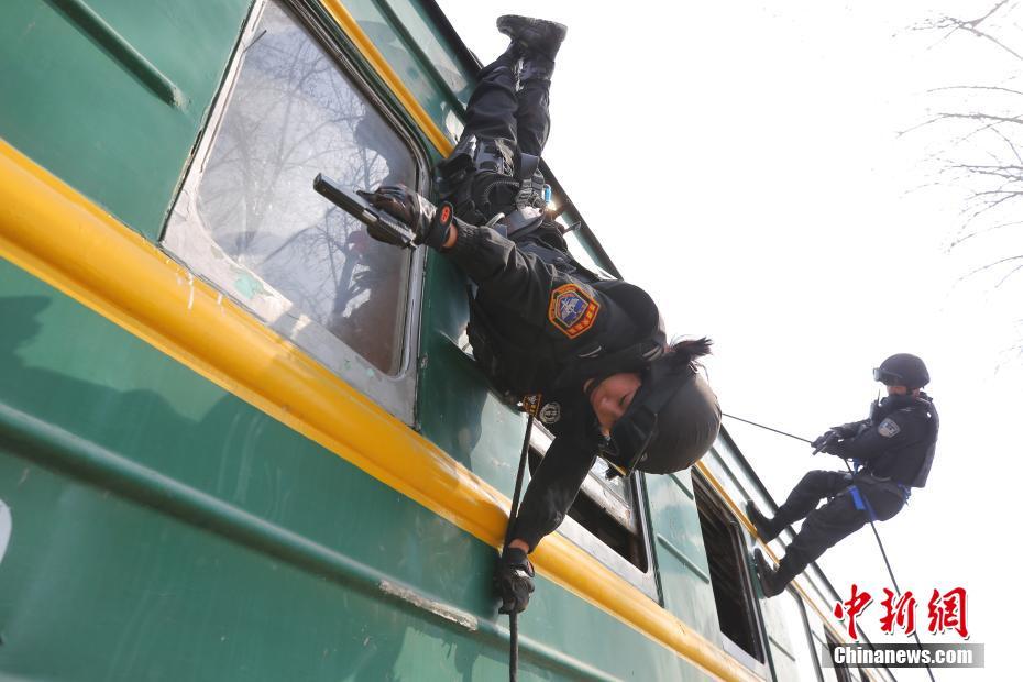 3月6日,北京鐵路公安處特警支隊鐵鷹突擊隊副大隊長鮑金鳳帶著男隊員進行科目訓練。在男性占絕大多數的的特警支隊中,女特警格外亮眼。進入2018春運以來,30歲的鮑金鳳隊長擔負起新學員的訓練工作,每天帶早操,一天四練,體能、射擊、綜合技能,高難度的科目動作,這個女隊長為男警員做示范。中新社記者楊可佳 攝