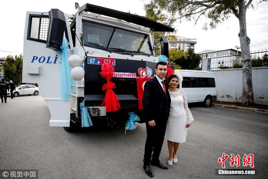 當?shù)貢r間2018年3月21日,土耳其安塔利亞,警官Ceren Ekici和Taha YasinGul舉行婚禮。在10個月前的一次行動中,Taha YasinGul不慎開槍擊中Ceren Ekici的頭部,所幸沒有造成生命危險。他們的婚禮由警局同事操辦,同事們舉著防彈盾牌,護送這對新人走向禮臺。圖片來源:視覺中國