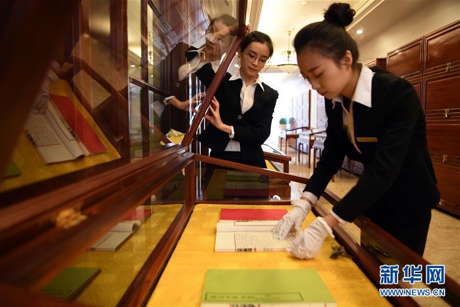 在甘肅天慶博物館,博物館工作人員劉妤(右)整理展柜中的影印本文淵閣《四庫全書》(4月20日攝)。新華社記者 范培珅攝