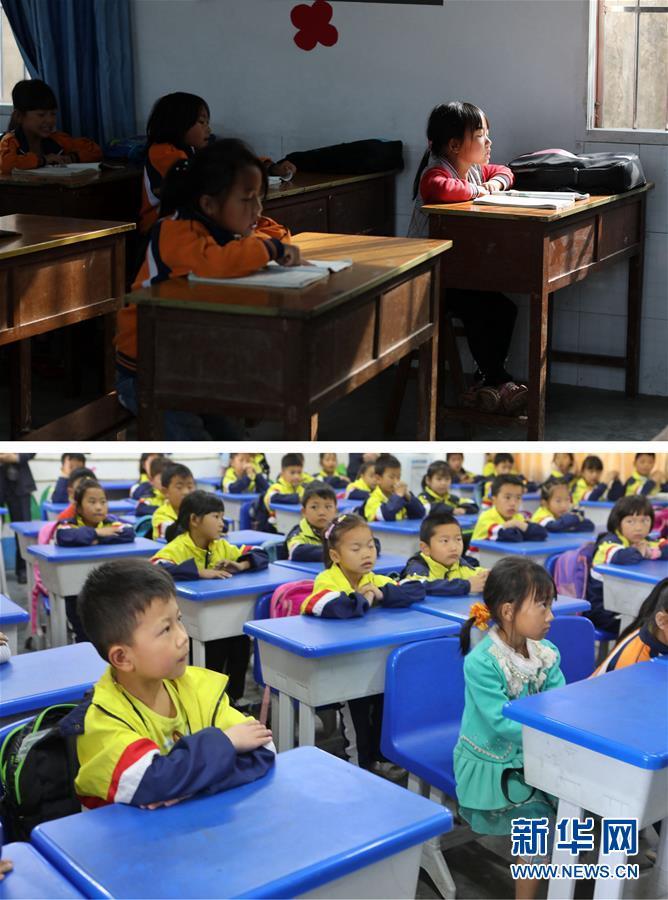拼版照片:上圖為7歲的李曉彤(右一)在華山小學(xué)教室內(nèi)晨讀(4月27日攝);下圖為7歲的李曉彤(前排左二)在黔西縣第十小學(xué)教室內(nèi)上課(5月7日攝)。貴州省黔西縣金蘭鎮(zhèn)瓦房村哈沖組位于六沖河岸邊的崖壁下,哈沖組的孩子們每天要往返崖壁上的山路才能到達(dá)華山小學(xué)就讀。28年來,崖壁上約4公里山路成了當(dāng)?shù)孛缱鍖W(xué)生艱難危險(xiǎn)的求學(xué)路。 5月5日起,哈沖組里的苗族同胞陸續(xù)通過易地扶貧搬遷至縣城的錦繡花都安置點(diǎn),孩子們也陸續(xù)搬至黔西縣第十小學(xué)就讀。自此,孩子們的上學(xué)路從約2個(gè)小時(shí)艱難跋涉的崖壁山路變?yōu)椴叫兄恍枰胄r(shí)的公路。求學(xué)之路“天塹變通途”,哈沖組村民幾代人的崖壁求學(xué)路成為歷史。新華社記者歐東衢攝