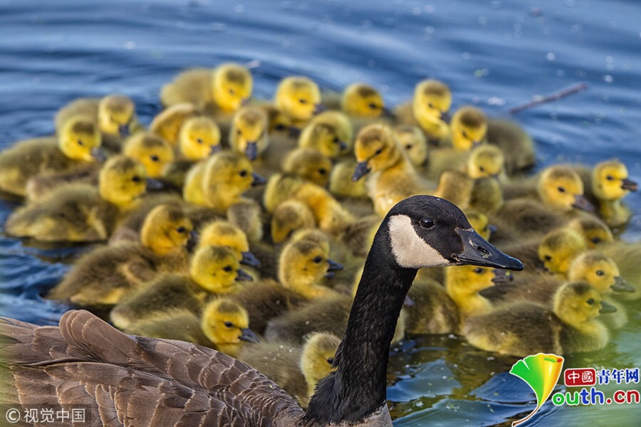 這只加拿大鵝和它的伴侶幫初次當父母的同伴照看小孩,幼鵝們整齊劃一的樣子十分可愛,似幼兒園春游。