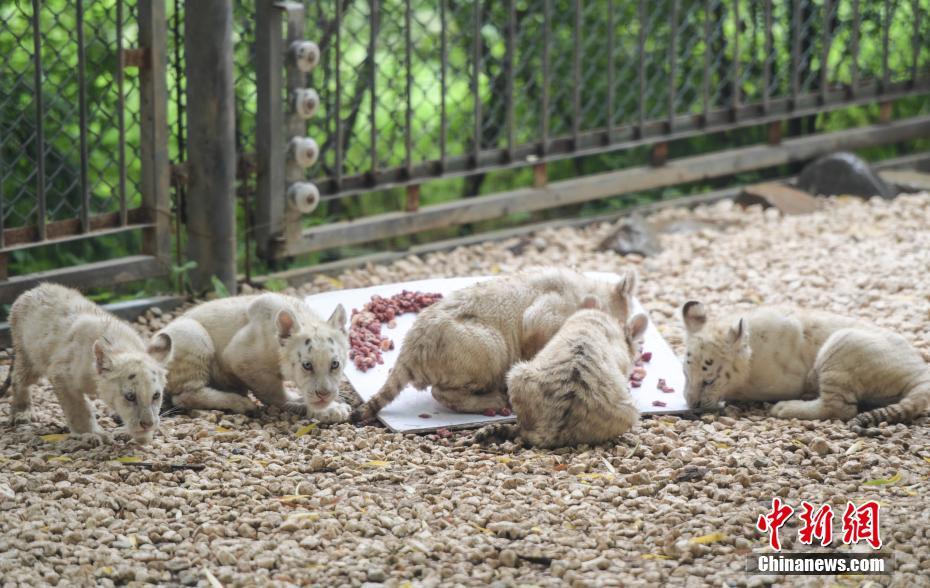 7月10日,雪虎五胞胎分享“肉餡蛋糕”。當(dāng)日,濟南野生動物世界五胞胎雪虎誕生滿百日,正式與游客見面。中新社記者 張勇攝