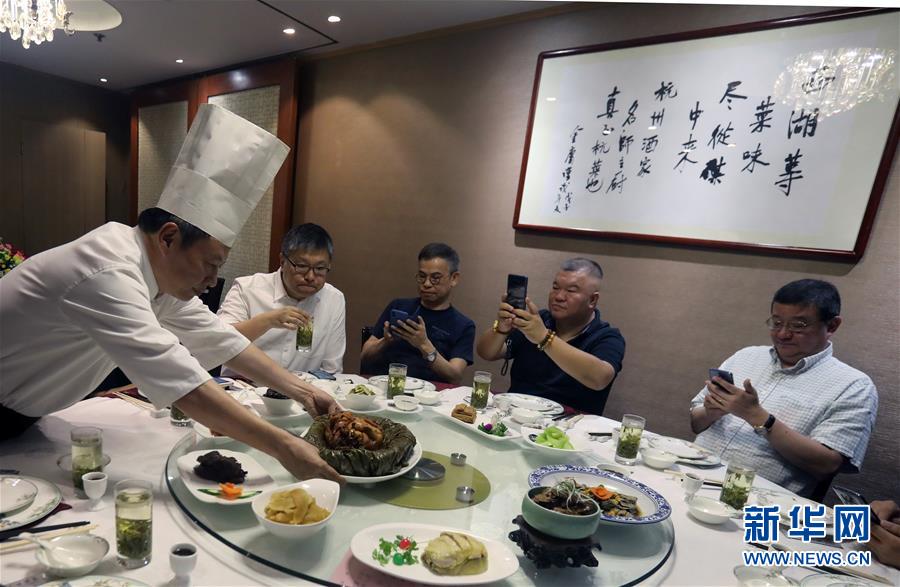 杭州酒家老板吳瑞康為客人端上自己親自制作的“叫化雞”(6月16日攝)。 金庸在武俠小說《神雕俠侶》中借郭靖之口說過: “為國為民,俠之大者?!蔽鋫b精神在香港備受推崇,有其心向中華文化的情感基礎。在這個國際美食之都,品味舌尖上的武俠味,內(nèi)中的感覺別有深意。新華社記者 李鵬 攝