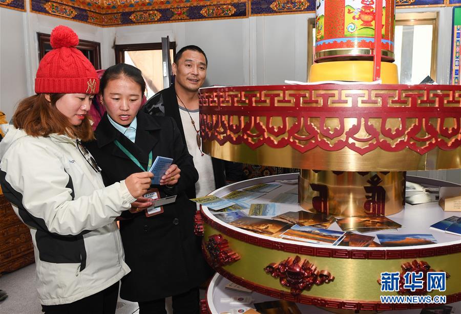 7月24日,天上西藏郵局營(yíng)業(yè)員措姆(中)為游客介紹特色明信片。