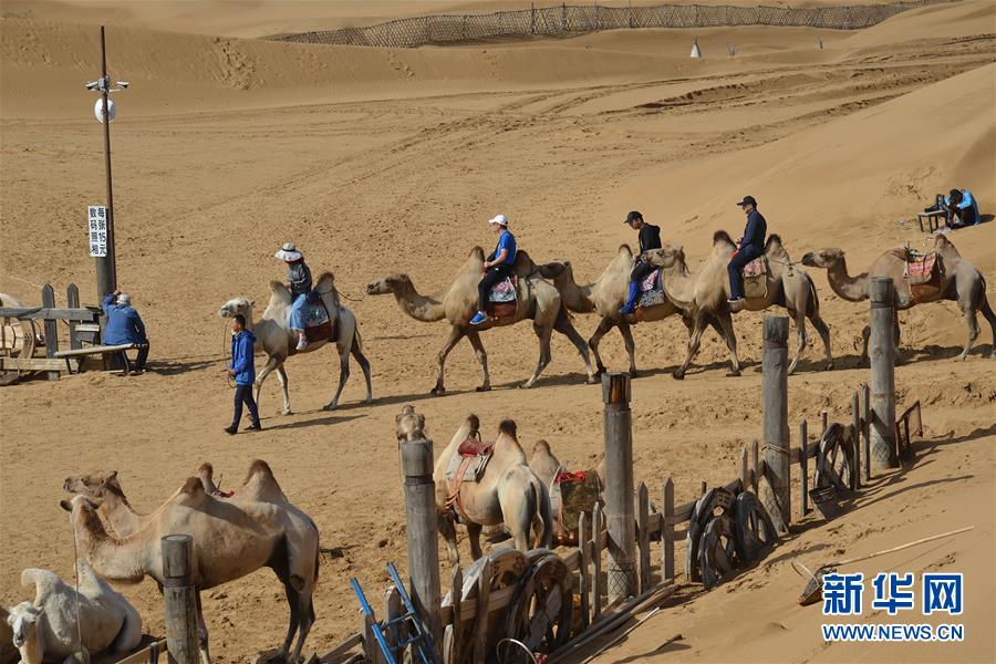 7月21日,在內(nèi)蒙古庫布其沙漠響沙灣景區(qū),游客體驗騎駱駝。