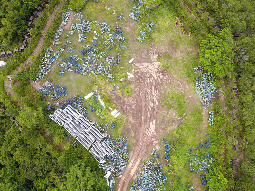 從高空俯瞰,安托山山頂?shù)墓蚕韱诬嚩逊e無序、且周圍雜草叢生,猶如一片共享單車“墳場”