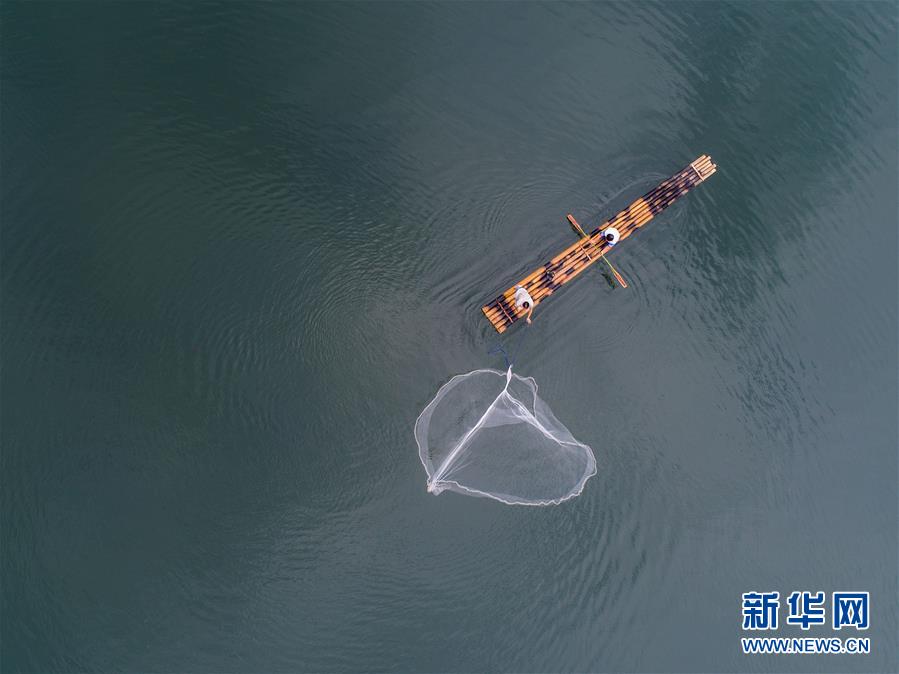 8月1日,淳安縣汾口鎮(zhèn)紅星村的漁民乘著竹排,在千島湖的支流武強溪上進行撒網(wǎng)捕撈作業(yè)(無人機拍攝)。 新華社記者 徐昱攝