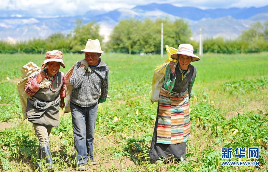 8月8日,在邊雄鄉(xiāng)普夏村蘿卜種植基地,白瑪梅朵合作社工作人員和當?shù)厝罕娨黄鹗斋@蘿卜。 新華社記者 張汝鋒 攝