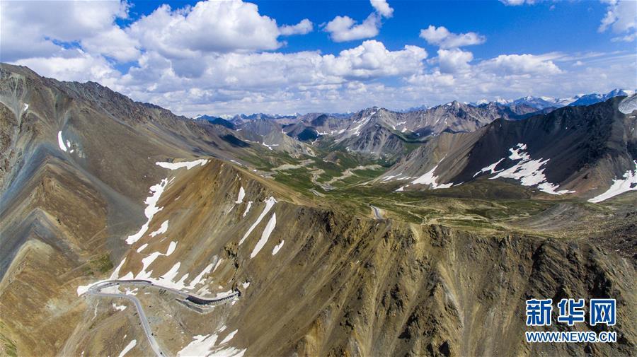 獨(dú)庫(kù)公路穿越海拔3390米的哈希勒根達(dá)坂(2017年7月13日無(wú)人機(jī)拍攝)。 新華社記者 江文耀 攝