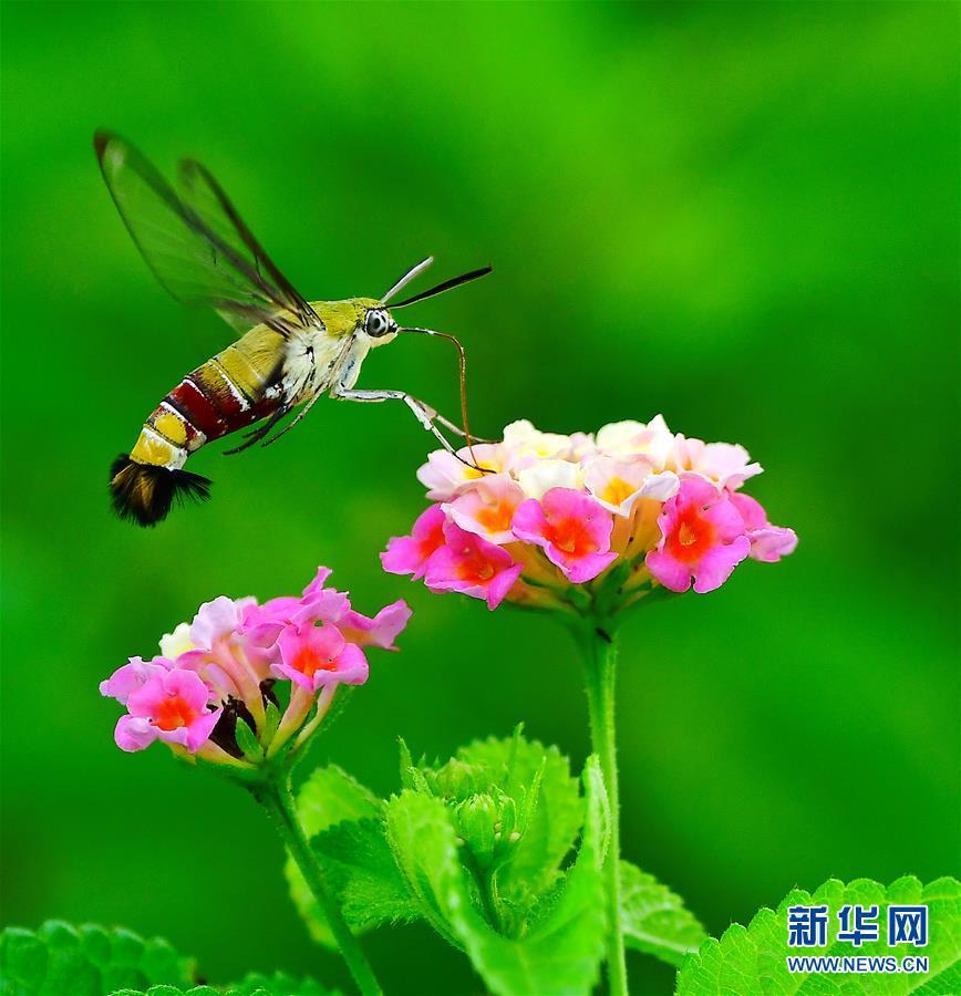 在福建省福州市溫泉公園,透翅天蛾在花間飛舞(8月18日攝)。近日,福建省福州市溫泉公園內的馬纓丹大面積開放。花紅、草綠、蟲飛,構成了一幅和諧的閩都生態(tài)圖景。 新華社記者梅永存攝