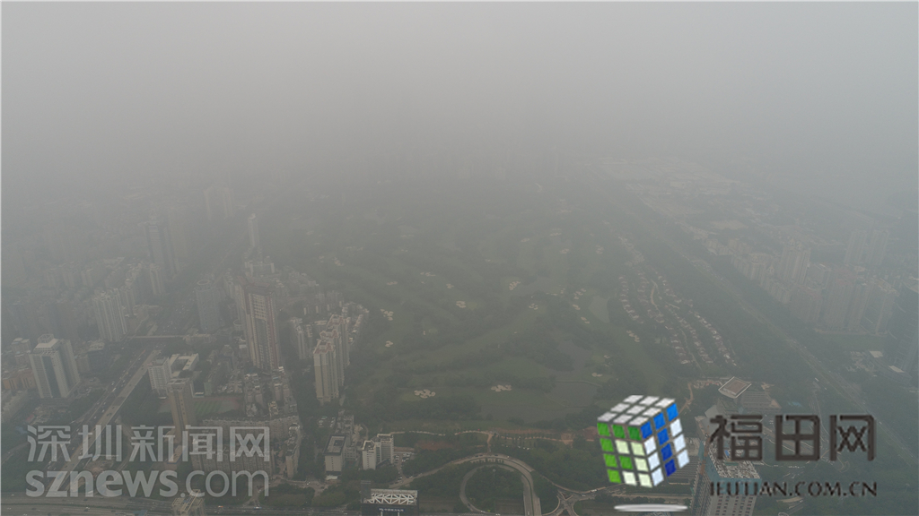 從平安大廈頂樓往下看,深圳高爾夫球場(chǎng)的綠地和湖泊已經(jīng)分辨不清了,能見度降到1公里。