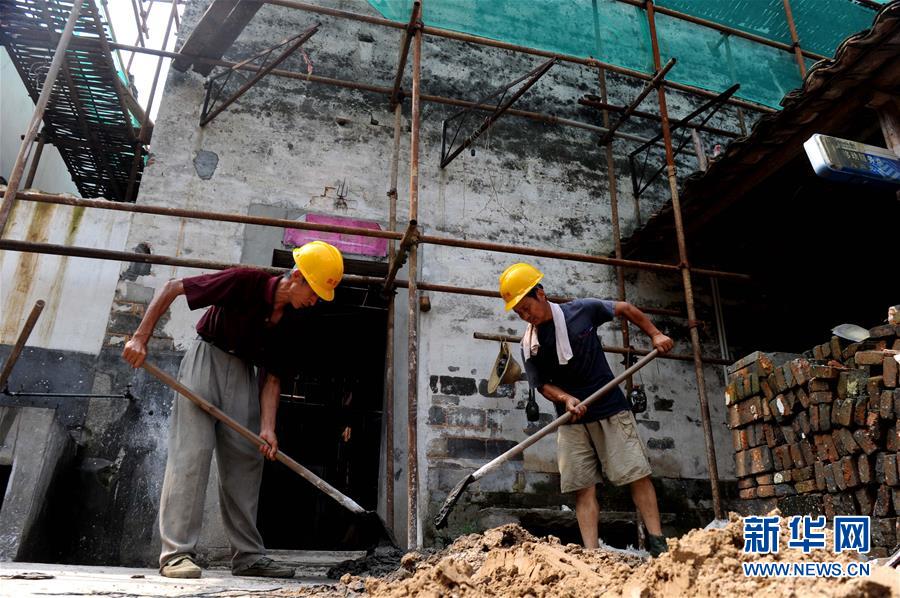工人在對安徽涇縣黃田古村落一處古民居進行修復施工(2014年7月10日攝)。