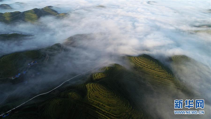 云霧繚繞的寧夏彭陽縣金雞坪梯田公園(7月17日無人機(jī)拍攝)。 新華社記者 王鵬 攝