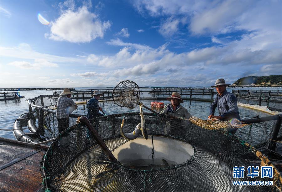 8月18日,南麂島海域內(nèi)的“海上牧場”養(yǎng)殖區(qū)內(nèi),漁民正捕撈大黃魚,處于仿生養(yǎng)殖環(huán)境的大黃魚需要生長2至3年。進入8月,浙江省溫州市平陽縣南麂鎮(zhèn)海域上大片的大黃魚、貽貝等特色海產(chǎn)品養(yǎng)殖區(qū)域迎來豐收季節(jié),養(yǎng)殖戶們駕駛漁船在養(yǎng)殖區(qū)海域進行打撈收獲,在碧海藍天下構(gòu)成了一幅“海上牧場”的美麗豐收景象。近年來,南麂鎮(zhèn)政府引導漁民養(yǎng)殖戶充分發(fā)揮“靠海吃?!钡馁Y源優(yōu)勢,大力發(fā)展海洋養(yǎng)殖經(jīng)濟和海島旅游經(jīng)濟,實現(xiàn)了南麂由“生態(tài)美”向“產(chǎn)業(yè)美”,“產(chǎn)業(yè)美”向“經(jīng)濟美”的轉(zhuǎn)變。同時該鎮(zhèn)堅持以大黃魚、貽貝等為特色產(chǎn)業(yè)支撐,精準發(fā)展高效海洋養(yǎng)殖業(yè),重點培養(yǎng)一批新型職業(yè)漁民,依靠專業(yè)技術(shù)支持,實現(xiàn)深海仿生養(yǎng)殖,讓好生態(tài)造就好品質(zhì),重點打造南麂養(yǎng)殖品牌,組建營銷網(wǎng)絡(luò),拓展特色海產(chǎn)品市場。新華社記者 徐昱攝
