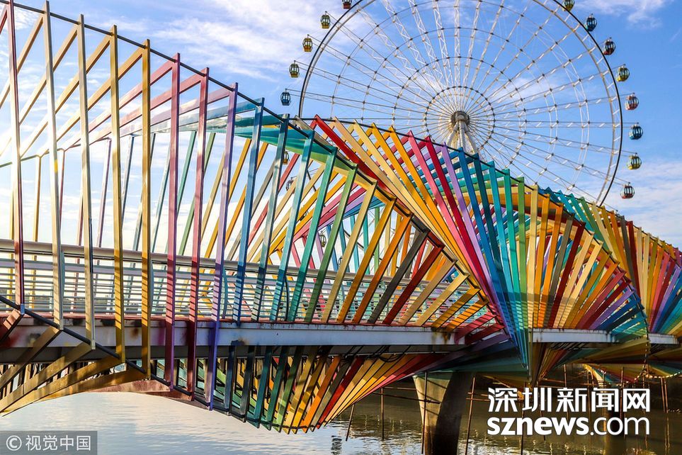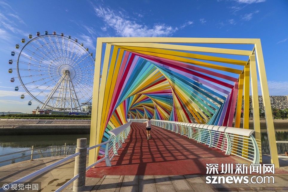 ????深圳新聞網(wǎng)訊? 2018年9月5日,山東青島,西海岸新區(qū)為唐島灣公園量身定制的“七彩橋”驚艷亮相,整個(gè)橋身色彩斑斕,造型別致。
