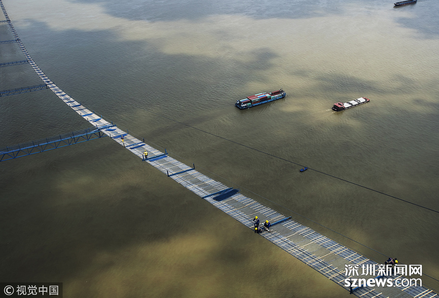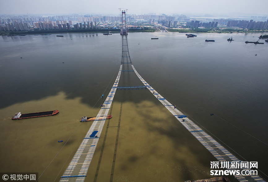 ???? 2018年5月14日,武漢,武漢楊泗港長(zhǎng)江大橋上空,上部結(jié)構(gòu)施工進(jìn)入貓道面網(wǎng)鋪設(shè)階段,數(shù)十名中鐵大橋局工人在跨江高空拼搏趕超,江面上空的臨時(shí)“吊橋”悄然形成。數(shù)十名工人在長(zhǎng)江上空228米處拼搏趕超,臨時(shí)“天梯”悄然形成。