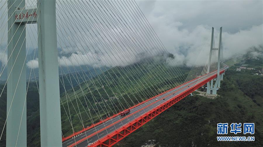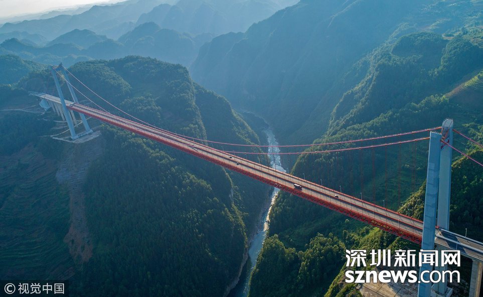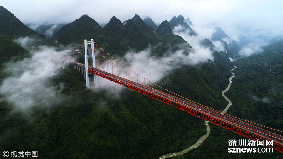 ??? 深圳新聞網(wǎng)訊? 畢都高速公路北盤江大橋是杭瑞高速公路畢都段的控制性工程,位于貴州省和云南省交界處,由貴州省和云南省共建。該橋橋面至江面高差達(dá) 565 米,成為目前世界第一高橋。主橋?yàn)殇撹炝盒崩瓨?,主?720 米,目前位居同類型橋梁2016 年12 月 29 日正式通車。